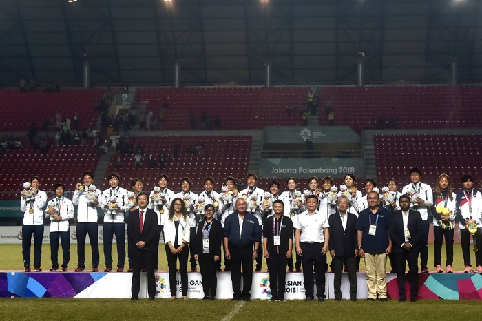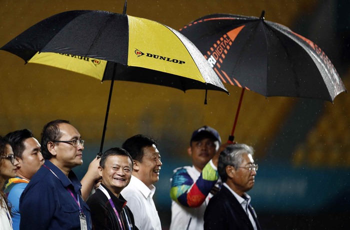 Jack Ma berkunjung ke stadion Gelora Sriwijaya untuk menyaksikan partai final sepak bola putri Asian Games antara Jepang melawan China. Foto: Edgar Su/REUTERS