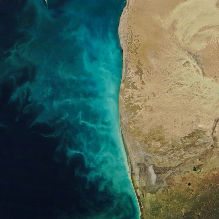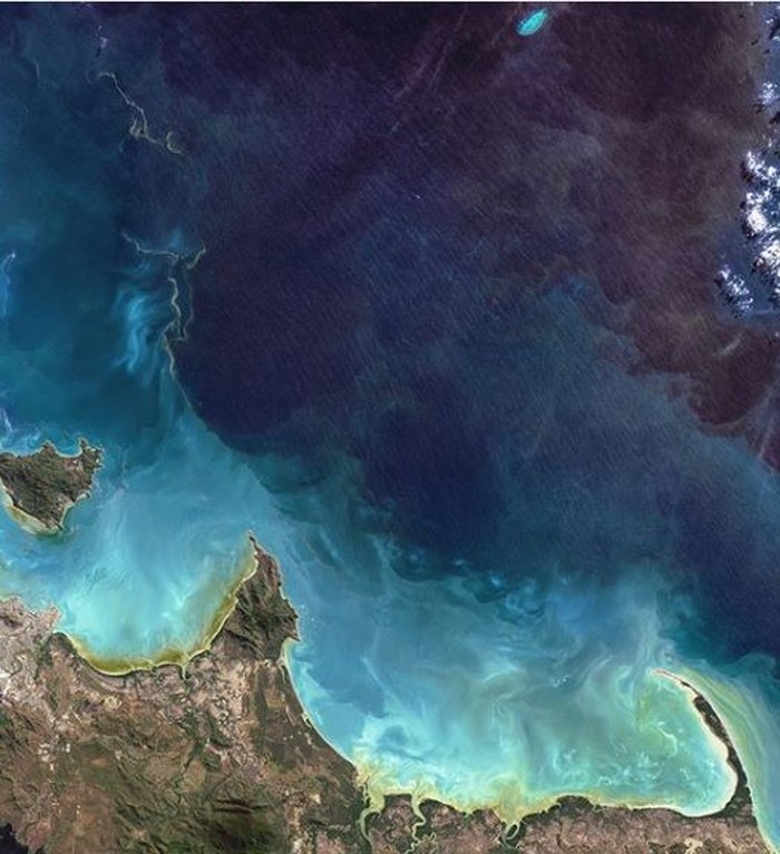 Australia juga punya pemandangan serupa di tepi lautnya. Di sana, fenomena tersebut disebabkan meledaknya jumlah Trichodesmium, sejenis bakteri. Foto: NASA