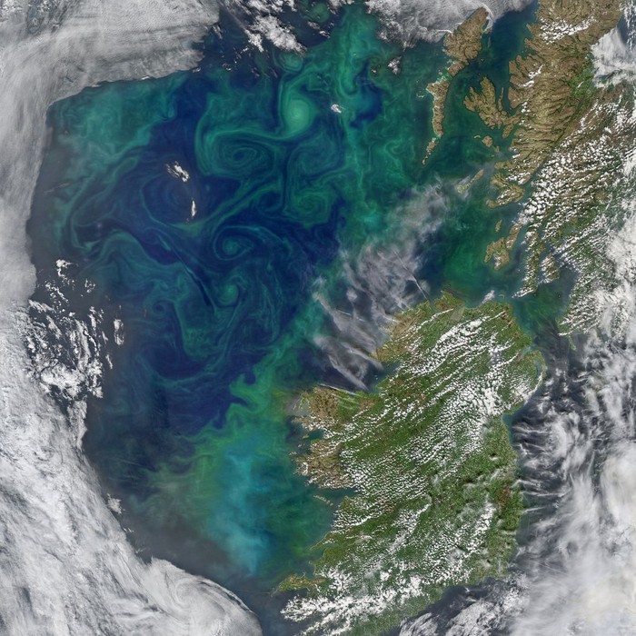 Fitoplankton kembali memunculkan 'aurora' di bawah laut, yang kali ini tampak di sebelah utara dan barat Irlandia serta Skotlandia. Foto: NASA
