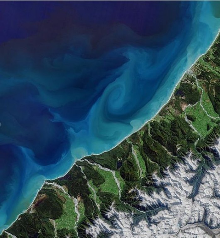 Salah satu tepian di Laut Tasman, Selandia Baru, juga menampilkan pemandangan serupa. Bedanya, itu disebabkan oleh penumpukan sedimen. Foto: NASA