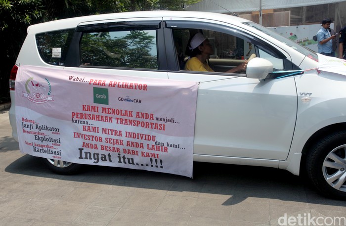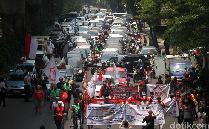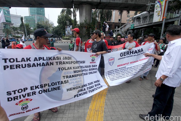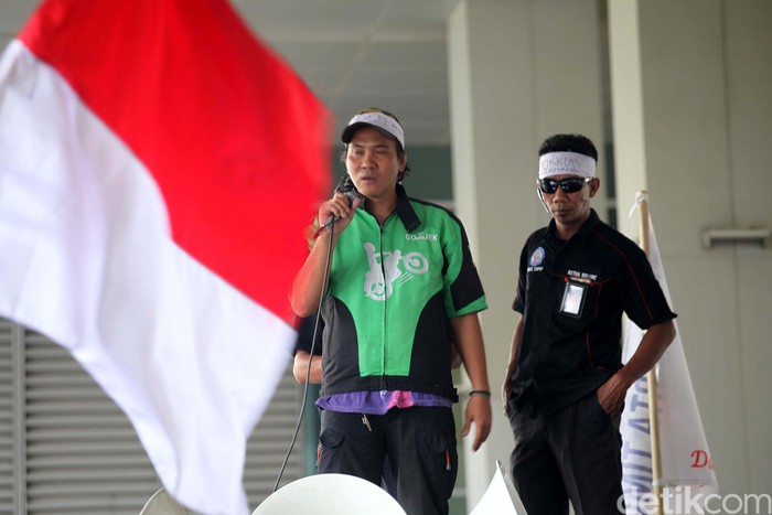 Lewat pengeras suara dari mobil komando, orator menyampaikan tuntutannya. Ada sejumlah poin yang jadi tuntutan mereka. Di antaranya, menolak aplikasi menjadi perusahaan transportasi, serta setop eksploitasi mitra pengemudi online.