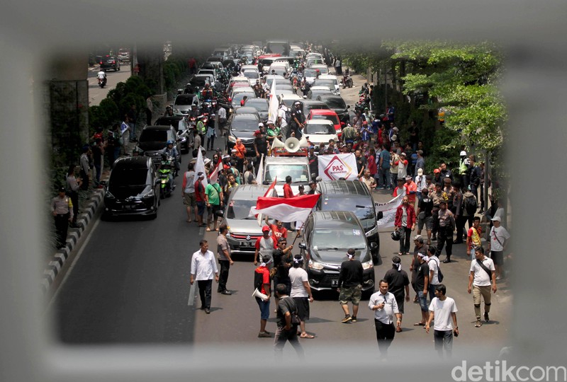 Mobil-mobil para peserta aksi demo terparkir di badan jalan memakan dua lajur. Akibatnya, lalu lintas menjadi tersendat. Sejumlah personel Polisi Lalu Lintas tampak melakukan pengaturan di lokasi.