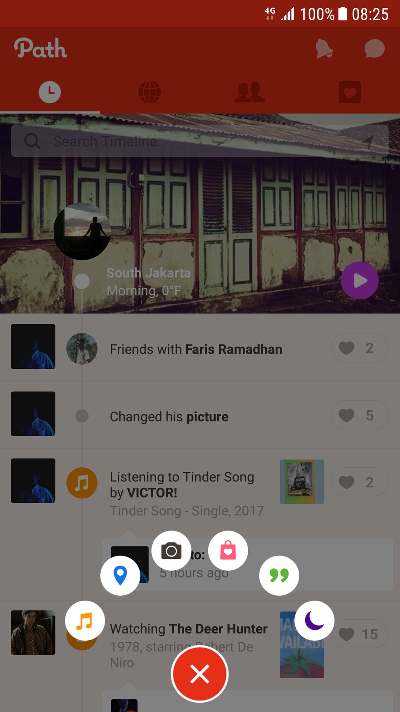 Ini adalah tampilan utama dari aplikasi Path berupa linimasa dari pemilik akun berdasarkan pertemanannya. Foto: Screenshot Path