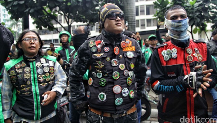Para pengemudi ojek online berdatangan, lengkap dengan atribut seperti jaket dan bendera.