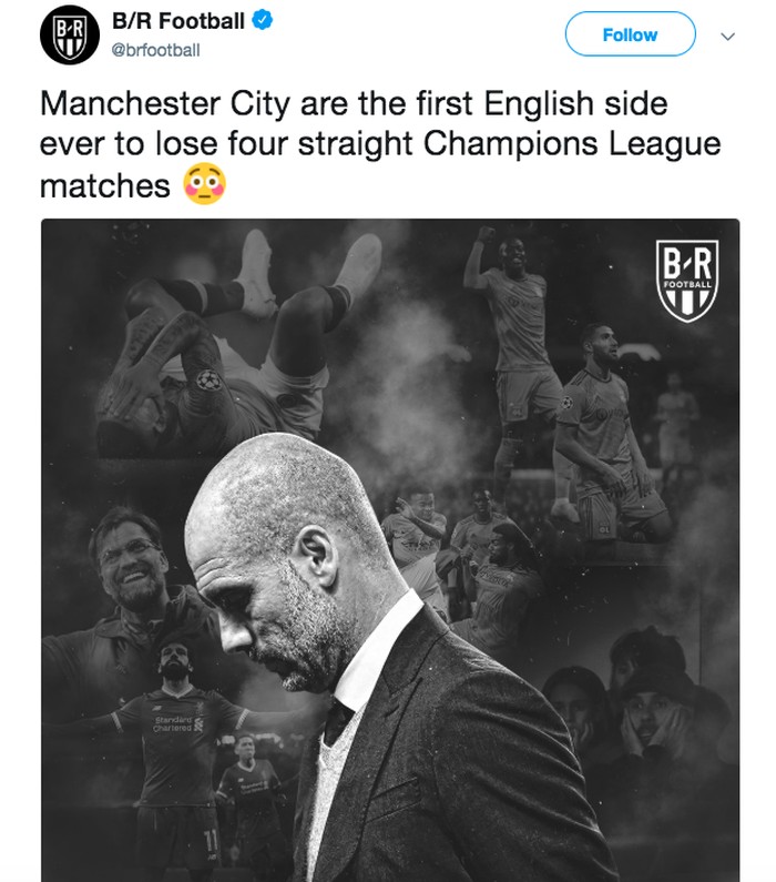 City menjadi tim Inggris pertama yang kalah empat kali berturut turut di Liga Champions. Foto: Twitter