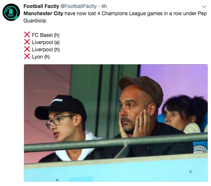 Sudah 4 kali berturut-turut City kalah di Liga Champions. Foto: Twitter