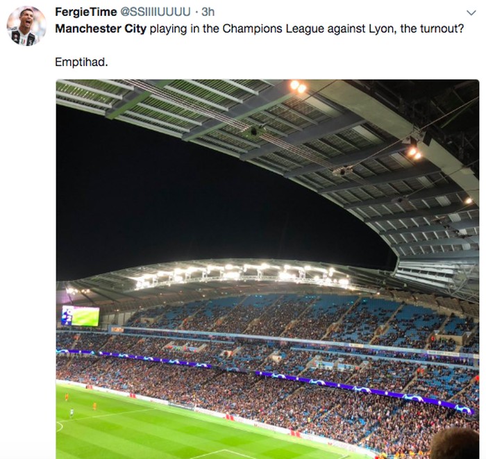 Netizen juga menyindir stadion Etihad yang banyak bangku kosongnya. Foto: Twitter