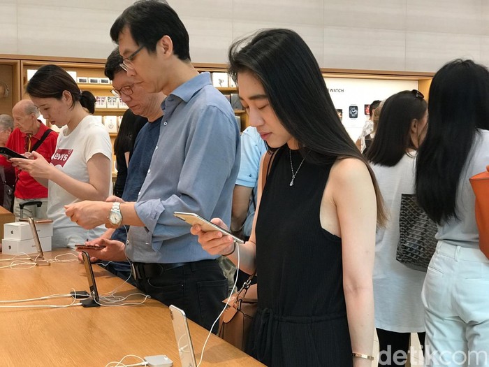 Asyiknya menjajalΒ iPhone baru di Apple Store Singapura. (Foto: detikINET/Adi Fida Rahman)