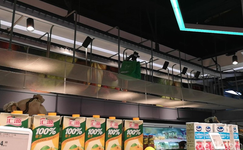 Selesai berbelanja, kita memindai sendiri belanjaan yang dibeli. Tak ada kasir. Pembayaran langsung terdebet dari akun Alipay. Kemudian barang ditempatkan di tas khusus, masuk jalur kereta dan diantar ke rumah. Foto: detikINET/Rachmatunnisa
