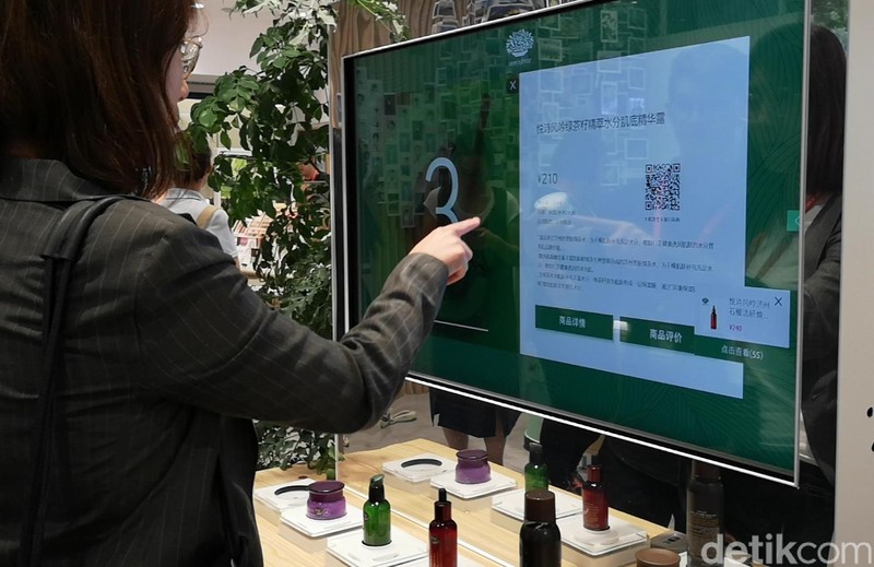 Katalog produk pun dihadirkan dalam wujud digital pada sebuah layar besar. Tinggal cari dan pilih. Lalu pembayaran akan otomatis terdebet di akun Alipay. Canggih dan menyenangkan ya. Foto: Rachmatunnisa/detikINET