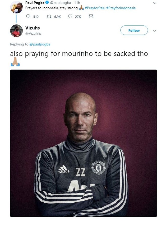 Cuitan Paul Pogba yang berisi doa untuk korban gempa dan tsunami di Palu pun ditimpali netizen dengan doa agar Mourinho juga dipecat. Foto: Istimewa