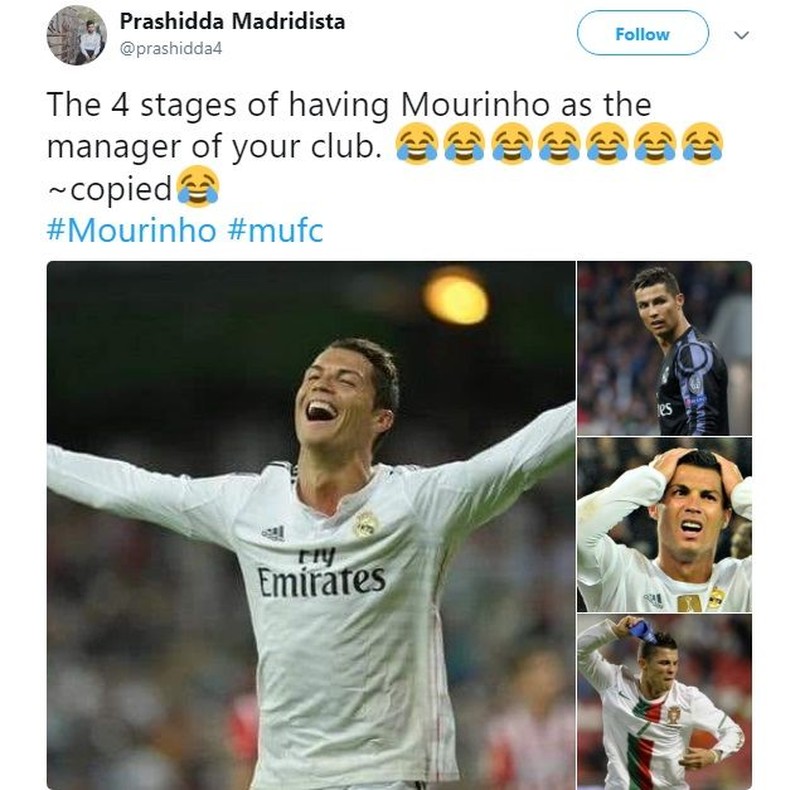 Di Twitter pun, sudah banyak meme lucu soal kiprah Mourinho di MU. Salah satunya empat tahap perjalanannya dalam melatih sebuah klub ini. Foto: Istimewa