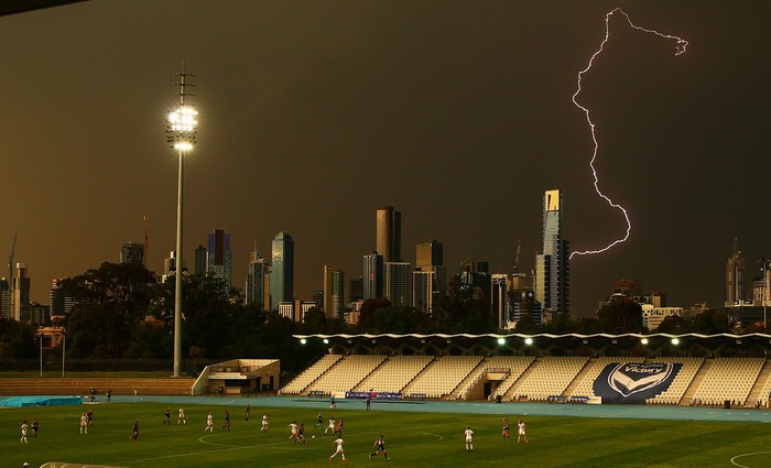 Pemandangan keren namun menakutkan di mana petir menyambar gedung-gedung tinggi di kota Melbourne. Foto diambil saat pertandingan bisbol pada tahun 2017 oleh fotografer Scott Barbour. (Foto: Getty Images)