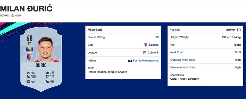 Milan Duric, ST asal Bosnia Herzegovina yang main di Salernitana. Umur 28 tahun dengan tinggi badan 1,99 meter. (Foto: FIFPlay.com)