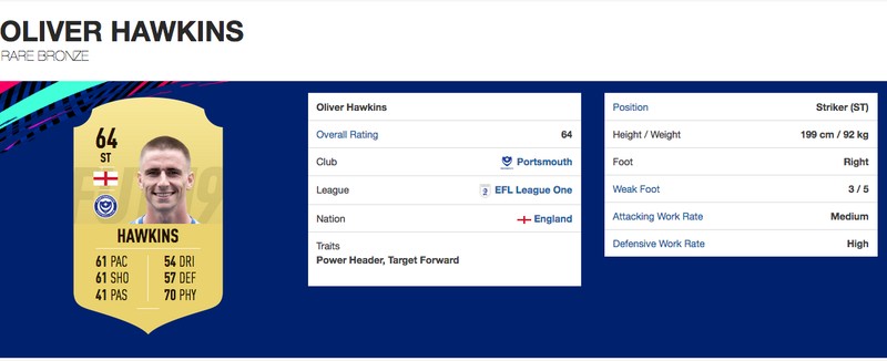 Oliver Hawkins, ST/CB asal Inggris yang main di Portsmouth. Umur 26 tahun dengan tinggi badan 1,99 meter. (Foto: FIFPlay.com)