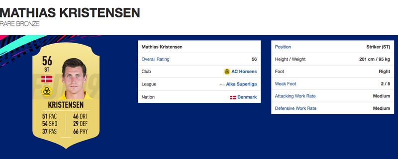 Mathias Kristensen, ST asal Denmark yang main di Horsens. Umur 25 tahun dengan tinggi badan 2,01 meter. (Foto: FIFPlay.com)