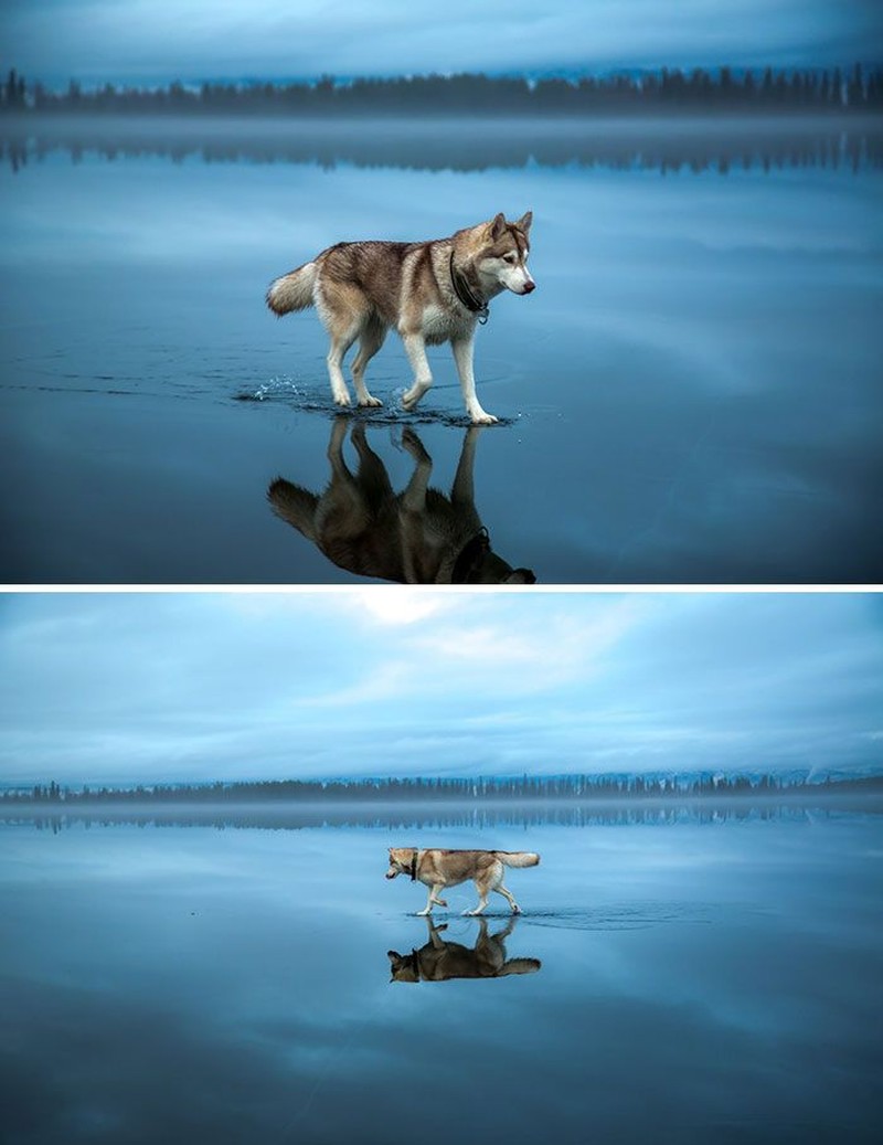 Anjing husky ini seolah bisa berjalan di permukaan air laut. (Foto: Boredpanda)