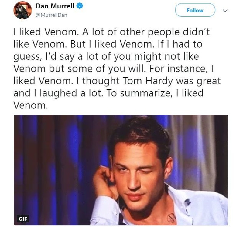 Walau penjelasannya panjang lebar, intinya pengguna Twitter satu ini bilang dia suka Venom. (Foto: Twitter)