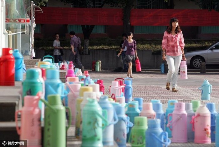 Orang China senang membawa termos air panas kemana-mana. Minum air hangat membantu mencegah banyak penyakit. Jadi kalau sakit, minum air hangat yang banyak. Foto: via Brightside