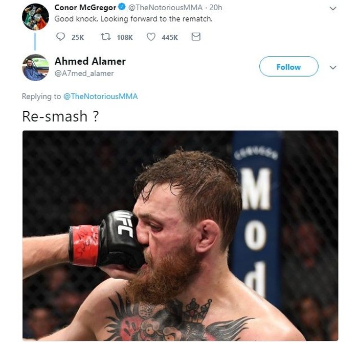 Saat menulis kicauan dirinya ingin bertarung lagi melawan Khabib, ada yang bilang dirinya bakal dihajar lagi. Foto: Istimewa