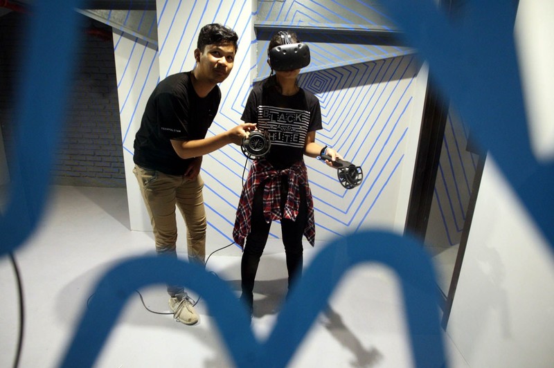 Seorang anak mencoba virtual games reality yang terdapat di Techpolitan The Breeze BSD City. Istimewa/Sinar Mas Land.