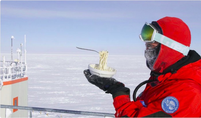 Meski begitu, para peneliti yang tinggal di Concordia memiliki koki yang membuatkan makanan mereka. Meski cadangan makanan segar masih sedikit, tapi Dokter Cyprien dan timnya kebanyakan mengonsumsi makanan beku atau frozen food. (Foto: Twitter)