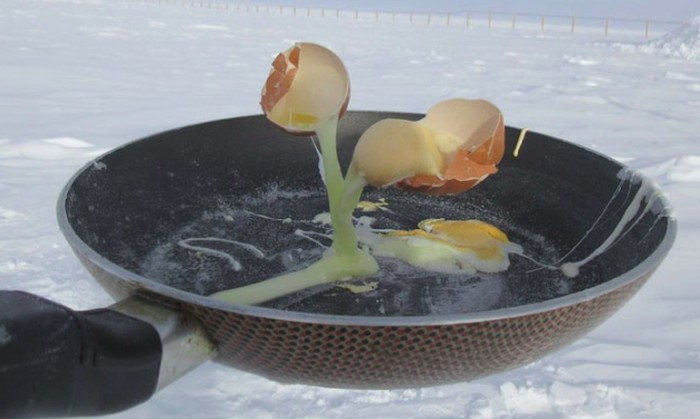 Saat mencoba memecahkan telur di atas wajan. Hasilnya dalam hitungan detik, cangkang telur dan lapisan telur membeku. Membuat telur ini terkesan seperti melayang di udara. (Foto: Twitter)