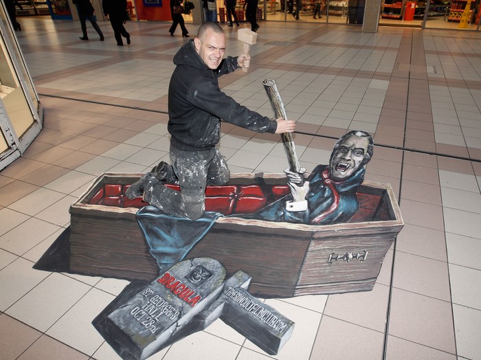 Seorang pekerja konstruksi di Liverpool, Inggris pura-pura sedang menancapkan pasak ke (gambar 3D) jantung Dracula pada Oktober 2010. (Foto: Christopher Furlong/Getty Images for Jameson)