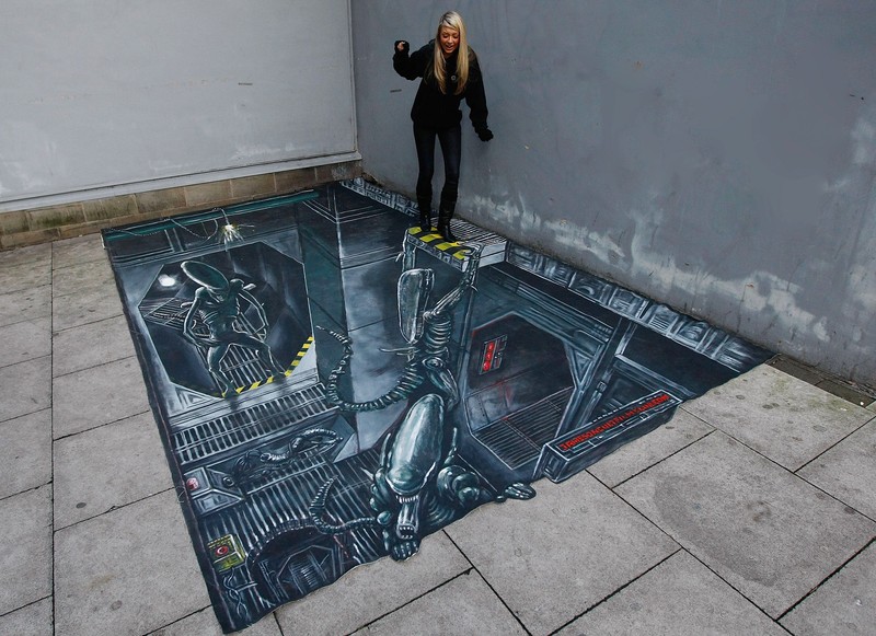 Gambar 3D di Manhchester, Inggris pada November 2010 ini terkesan membuat si gadis yang sedang berdiri di atasnya tak bisa kemana-mana lagi. (Foto: Tim Hales/Getty Images for Jameson)