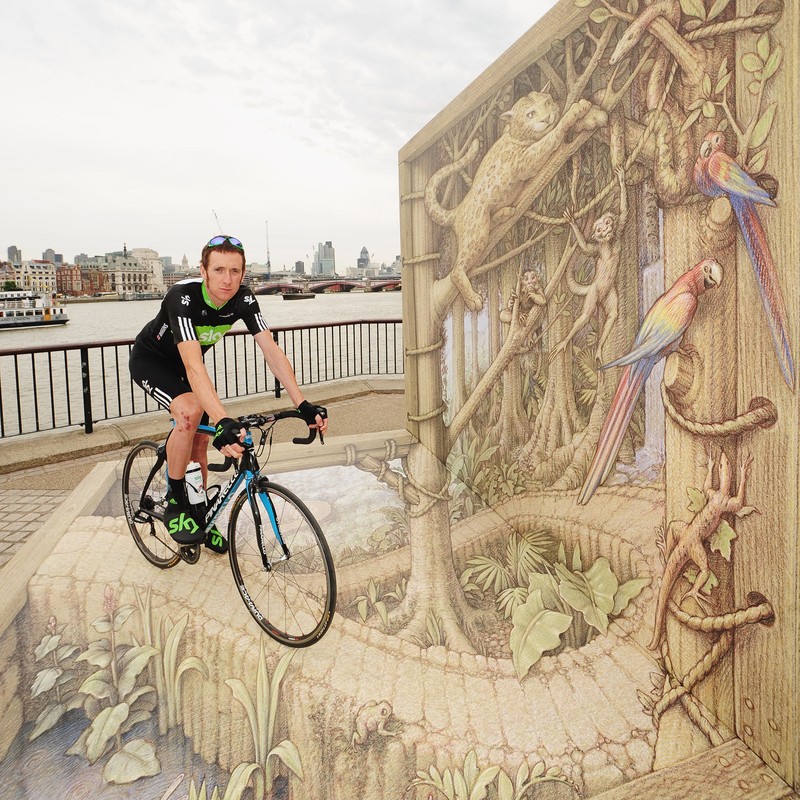 Olahragawan Bradley Wiggins di atas sebuah gambar 3D di tembok kota London, Inggris pada September 2010. (Foto: Ian Gavan/Getty Images for Sky 3D)