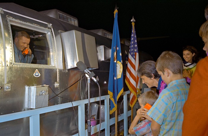 Pada 11 Agustus 1969, Armstrong baru dibolehkan keluar dari karantina untuk menemui keluarganya. Foto: Getty Images
