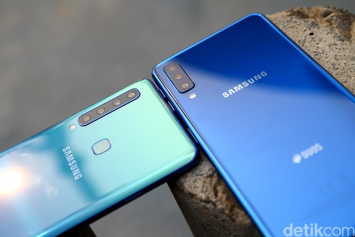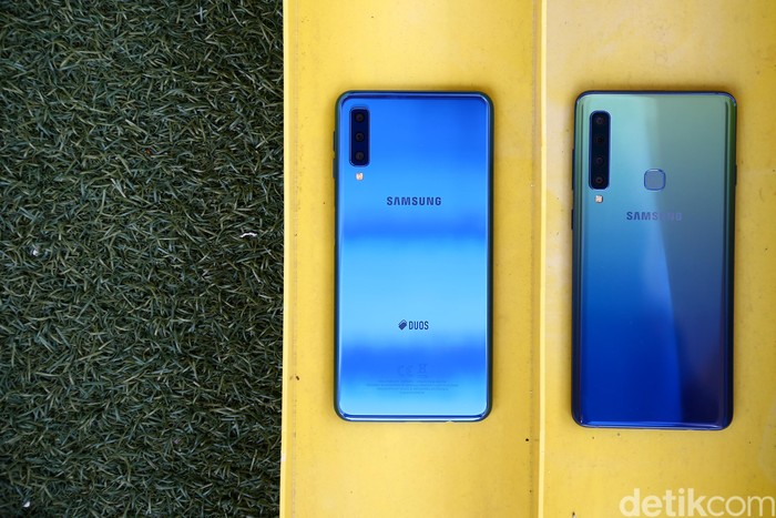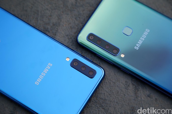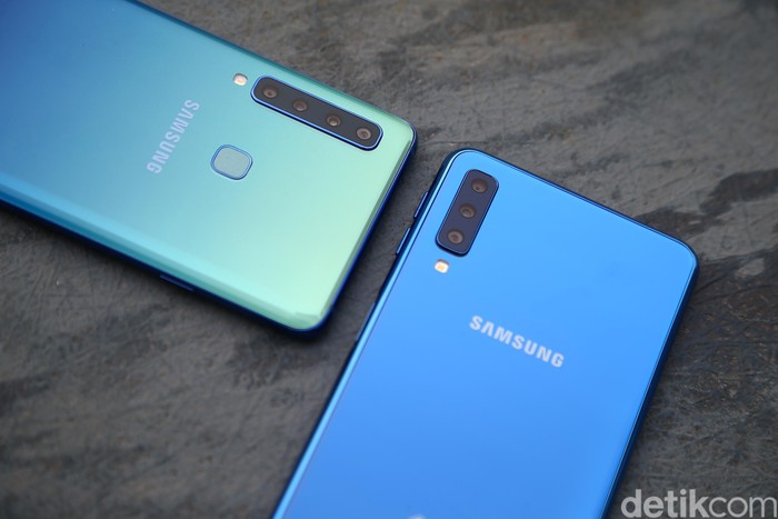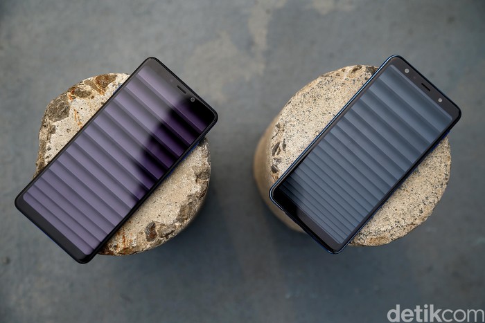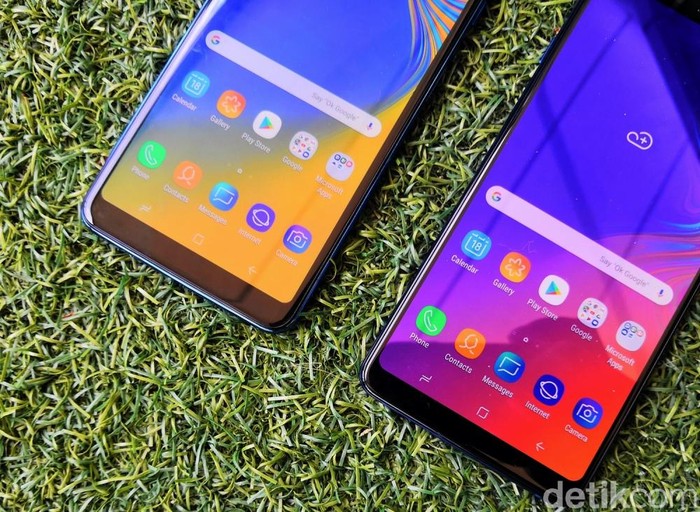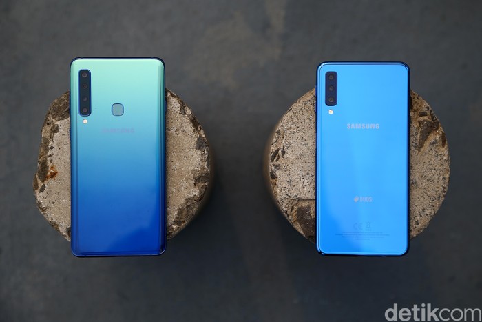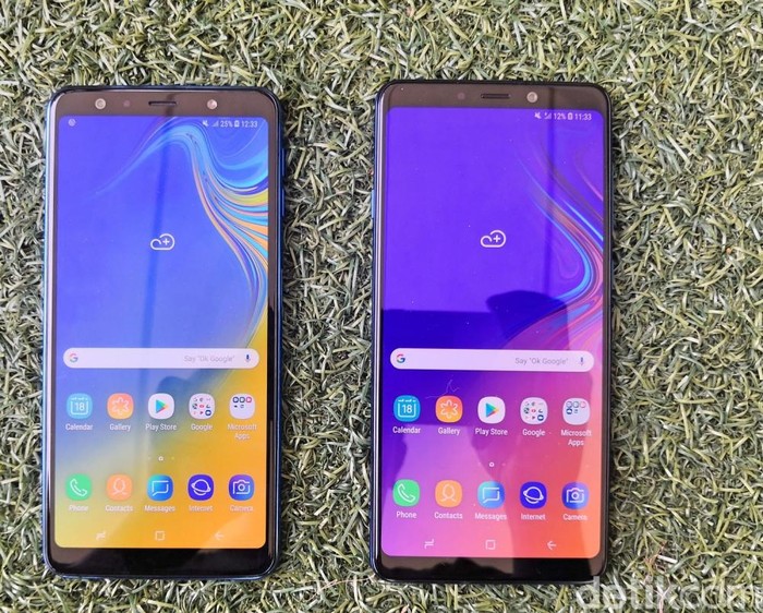 Galaxy A7 berada di sebelah kiri dan Galaxy A9 di sebelah kanan. Keduanya sama-sama mengusung bezel tipis dan layar Infinity Display, tapi A9 terlihat lebih besar dari A7. Galaxy A9 punya bentang layar 6,3 inch resolusi 2160 Γ 1080 pixel. Sedangkan A7 layarnya seluas 6 inch resolusi 1080 x 2220 pixel. Foto: Fino Yurio Kristo
