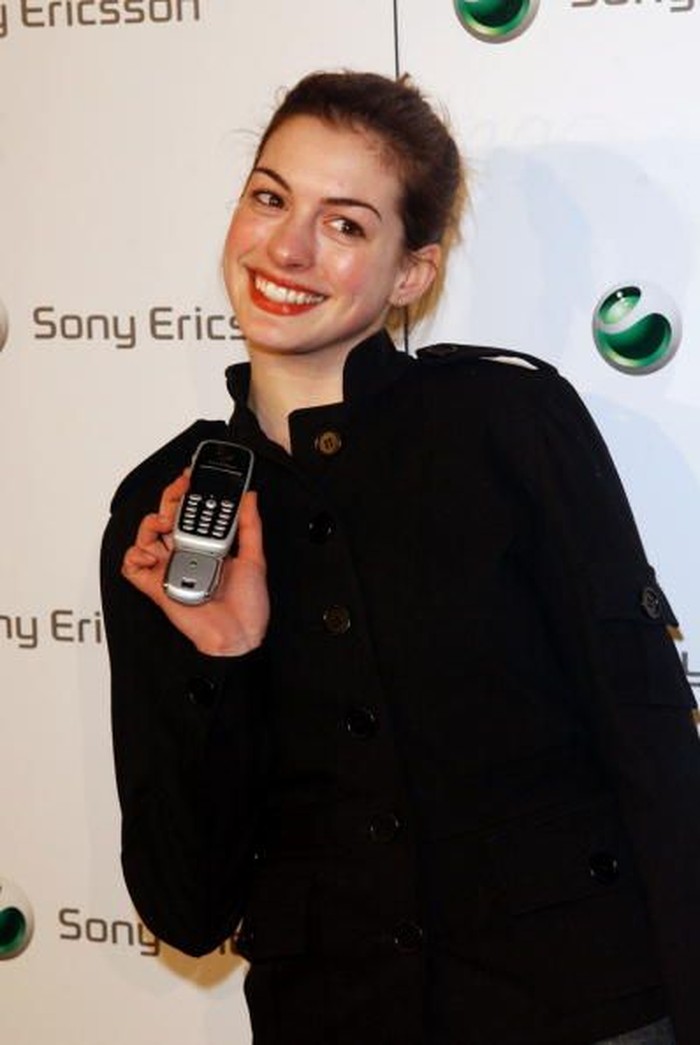 Aktris cantik Anne Hathaway memegang ponsel Sony Ericsson dengan sistem kamera tambahan yang dapat dilepas pasang. Foto: Getty Images