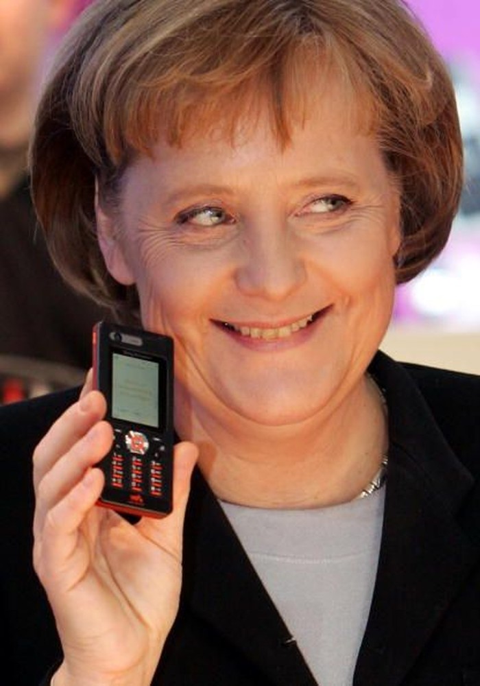 Kanselir Jerman Angela Merkel memegang salah satu model ponselnya. Foto: Getty Images
