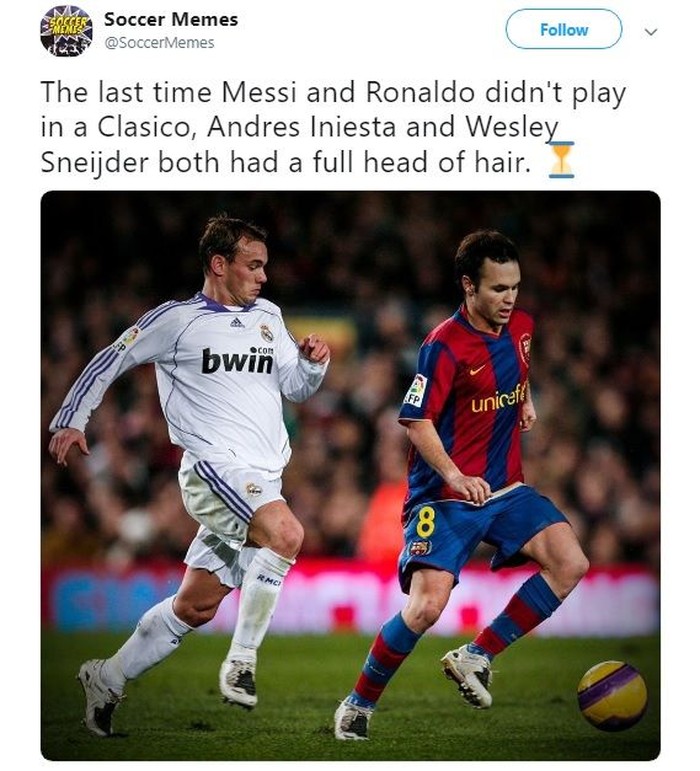 Terakhir kali El Clasico digelar tanpa Ronaldo dan Messi, Wesley Sneijder dan Andres Iniesta masih punya rambut loh. Foto: Istimewa