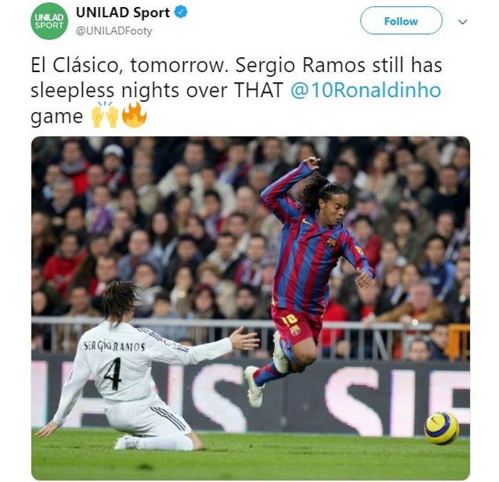 Dulu ketika El Clasico masih belum ada Ronaldo dan Messi, Sergio Ramos dipermalukan Ronaldinho. Akankah kejadian serupa menimpa Ramos lagi? Foto: Istimewa