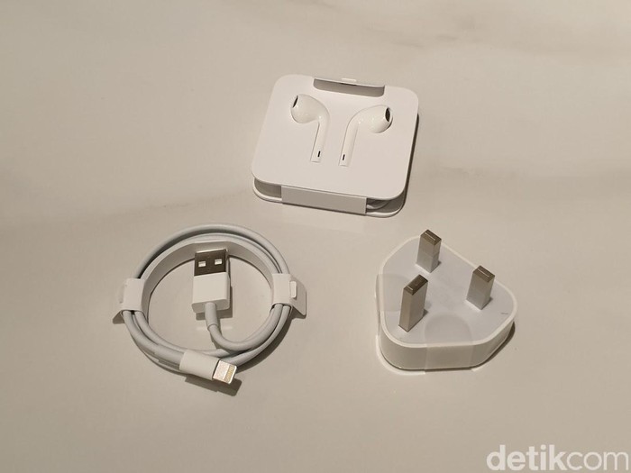 Aneka aksesori terdiri atas kepala charger, kabel data dan earphone. Seperti iPhone XS, tidak ada connector lightning ke jack audio 3,5 mm. Foto: Adi Fida Rahman/detikINET