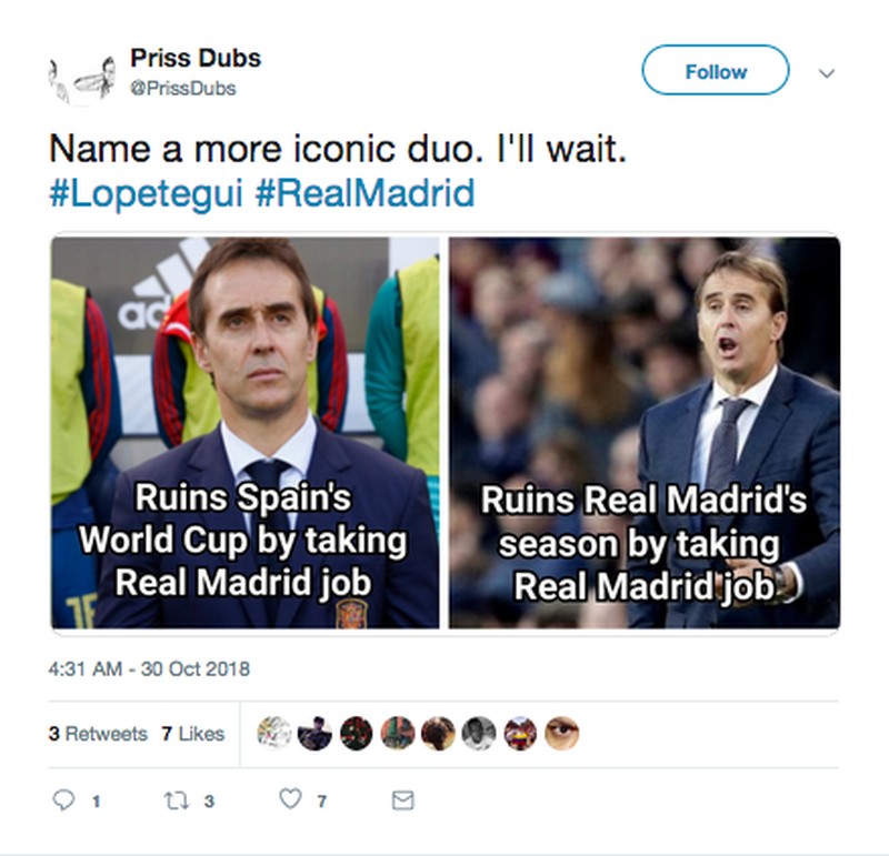 Meme ini mengolok Lopetegui yang musim panas lalu dipecat dari timnas Spanyol usai mengumumkan bakal melatih Madrid. (Foto: Internet/Twitter)