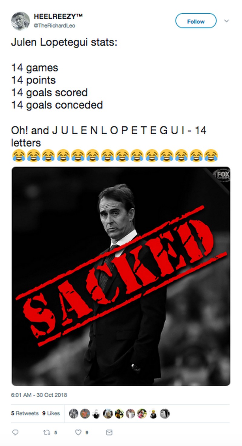 Meme ini menyoroti serba 14 dalam pemecatan Julen Lopetegui. Termasuk jumlah karakter dalam namanya. (Foto: Internet/Twitter)