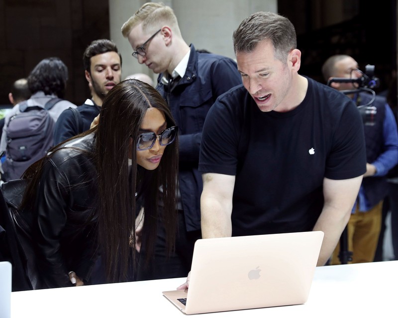 Model Naomi Campbell melihat-lihat MacBook Air versi warna gold. Foto: Reuters