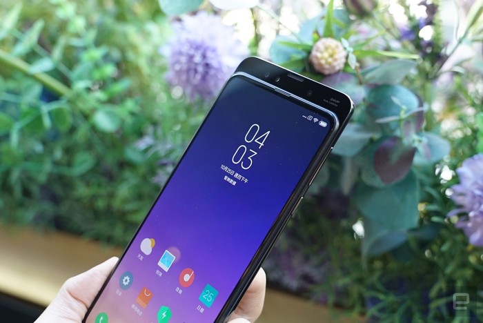 Kalau ini adalah Mi Mix 3, ponsel flagship yang baru saja diluncurkan Xiaomi. Seperti bisa dilihat, kamera depannya bergaya sliding yang dapat disembunyikan jika tidak dipakai. Foto: engadget