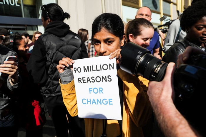 Seorang pegawai Google memegang kertas bertuliskan sejuta alasan untuk berubah. Aksi protes ini dipicu oleh laporan New York Times yang menulis kasus pelecehan seks bapak Android Andy Rubin, yang sudah mengundurkan diri dari Google sejak 2014. Yang dipermasalahkan dari kasus itu adalah Google tetap memberi pesangon pada Rubin setelah ia diketahui melakukan pelecehan seks terhadap bawahan. Foto: Reuters