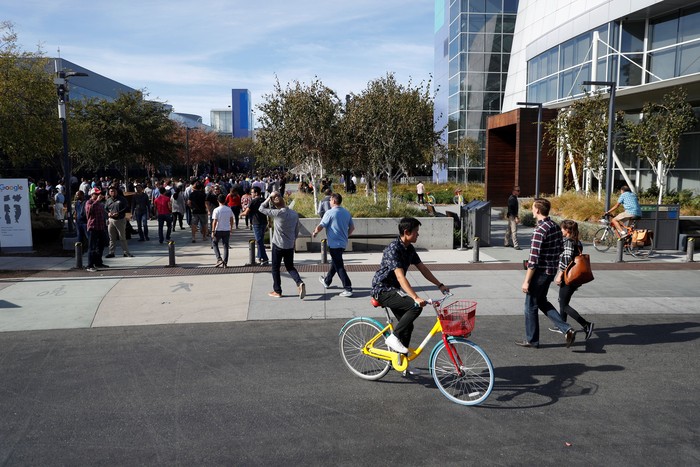 Salah satu bangunan utama di kantor pusat Google tak luput dari aksi demo. Foto: Reuters
