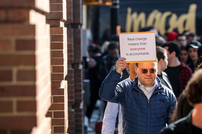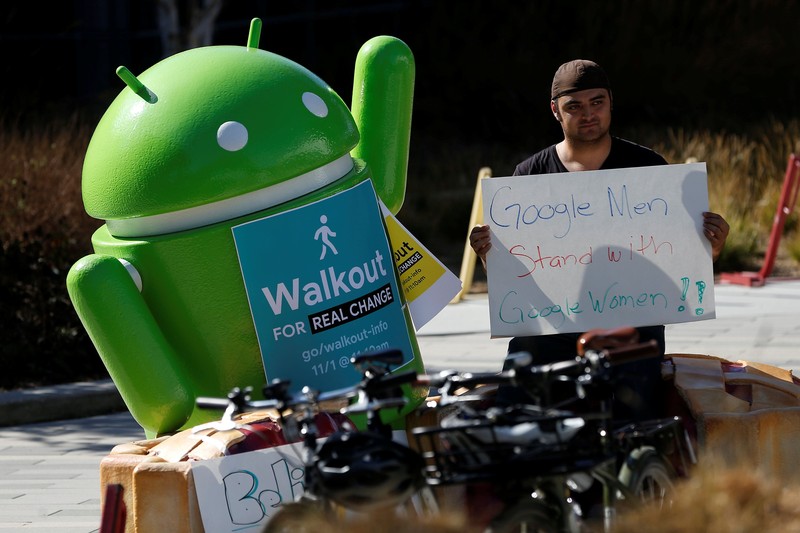 Seorang pegawai Google memegang kertas bertuliskan sejuta alasan untuk berubah. Aksi protes ini dipicu oleh laporan New York Times yang menulis kasus pelecehan seks bapak Android Andy Rubin, yang sudah mengundurkan diri dari Google sejak 2014. Yang dipermasalahkan dari kasus itu adalah Google tetap memberi pesangon pada Rubin setelah ia diketahui melakukan pelecehan seks terhadap bawahan. Foto: Reuters