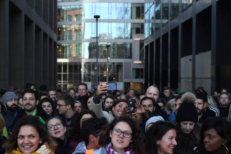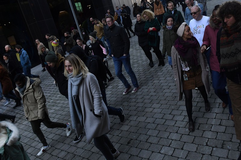Tampak para karyawan Google di Dublin berduyun duyun keluar dari kantornya. Ribuan karyawan -- kebanyakan di antaranya adalah perempuan -- berdemo dengan walkout, alias meninggalkan kantornya, di lebih dari 60% kantor Google di seluruh dunia pada pukul 11.10 kemarin siang waktu setempat. Foto: Reuters