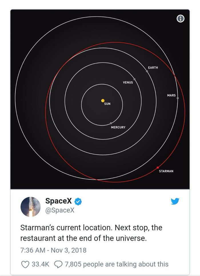 "Lokasi Starman saat ini. Pemberhentian berikutnya, restoran di akhir jagat raya," tulis SpaceX. Foto: Screenshot