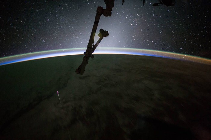 Astronot di International Space Station memotret foto jejak bintang yang luar biasa di atas Bumi yang bercahaya. ISS melaju dalam kecepatan cukup tinggi di atas sana.Β Foto: NASA
