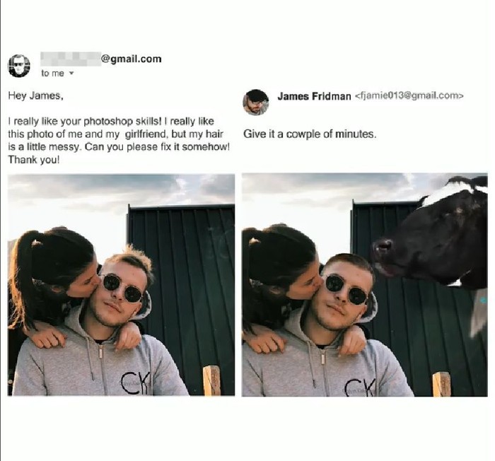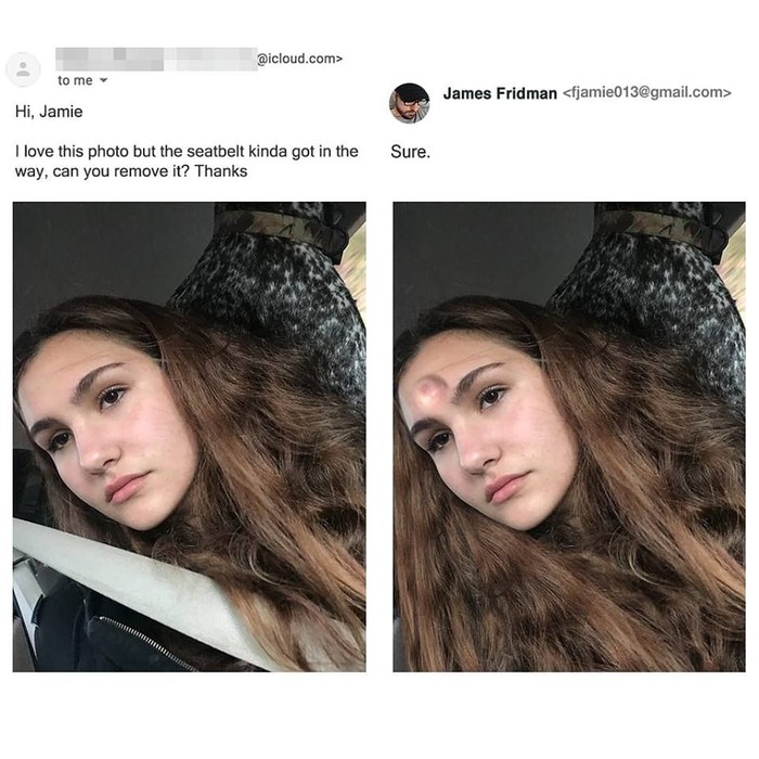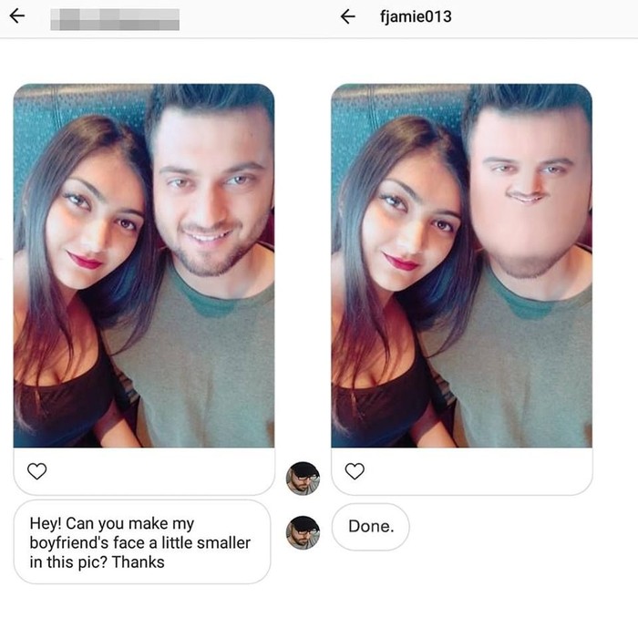 Inilah salah satu hasilnya, netizenΒ ingin wajah kekasihnya diedit sedikit lebih kecil. Foto: James Fridman