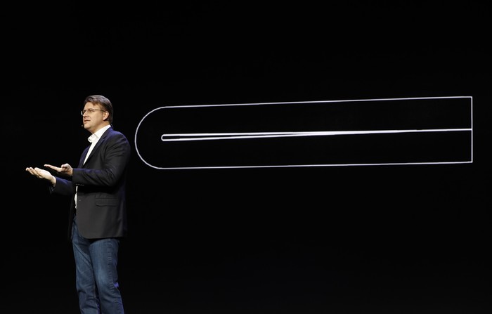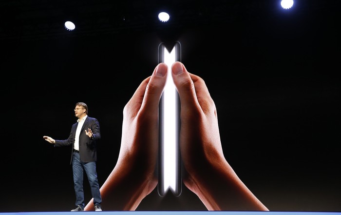 Dalam perhelatan di San Francisco, Justin Denilson selaku Senior Vice President Samsung Electronics America menunjukkan prototipe ponsel layar lipat. Foto: Reuters