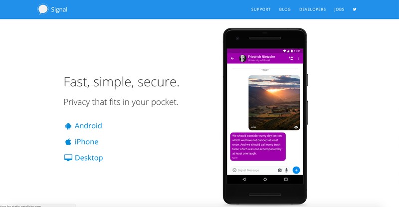 Signal. Pada dasarnya Signal sangat mirip dengan Telegram, sampai-sampai ada yang menjulukinya sebagai "kloningan". Tapi fitur dan kesederhanaan Signal membuat aplikasi ini tetap layak dijajal. Siapa tahu cocok. (Foto: signal.org)